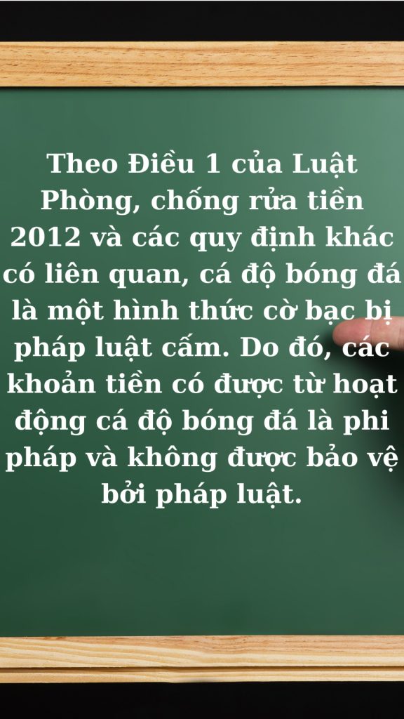 Theo Điều 1 của Luật Phòng, chống rửa tiền 2012 và các quy định khác có liên quan, cá độ bóng đá là một hình thức cờ bạc bị pháp luật cấm. Do đó, các khoản tiền có được từ hoạt động cá độ bóng đá là phi pháp và không được bảo vệ bởi pháp luật.