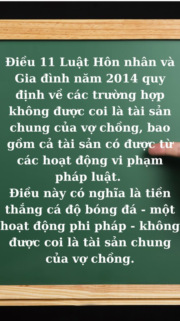 Điều 11 Luật Hôn nhân và Gia đình năm 2014 quy định về các trường hợp không được coi là tài sản chung của vợ chồng, bao gồm cả tài sản có được từ các hoạt động vi phạm pháp luật. Điều này có nghĩa là tiền thắng cá độ bóng đá – một hoạt động phi pháp – không được coi là tài sản chung của vợ chồng.